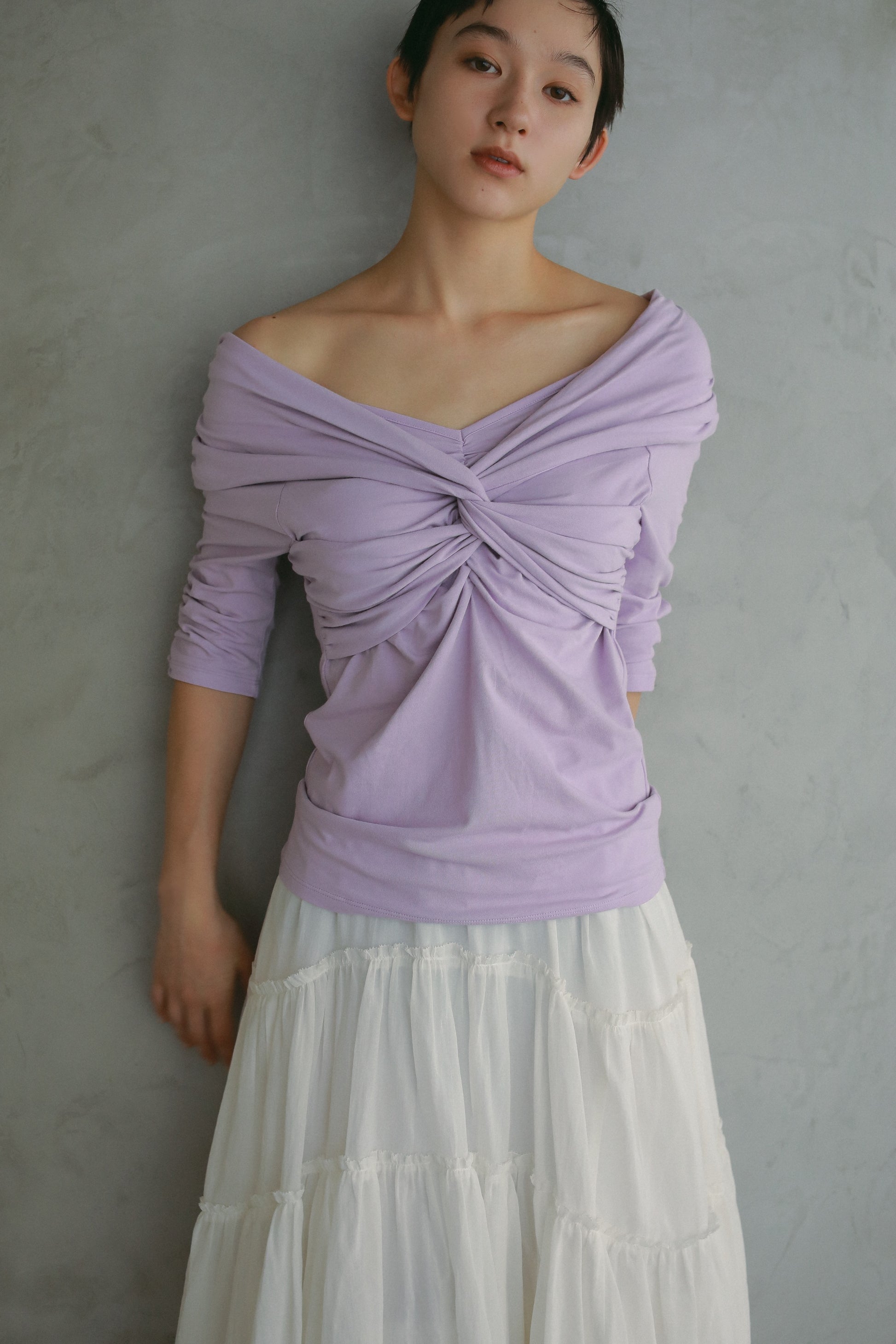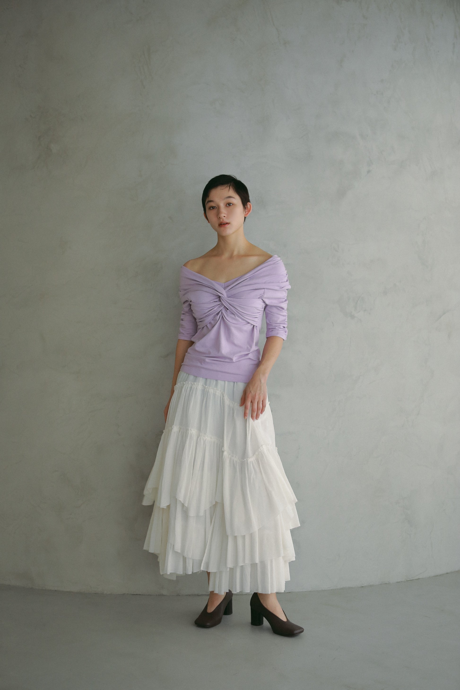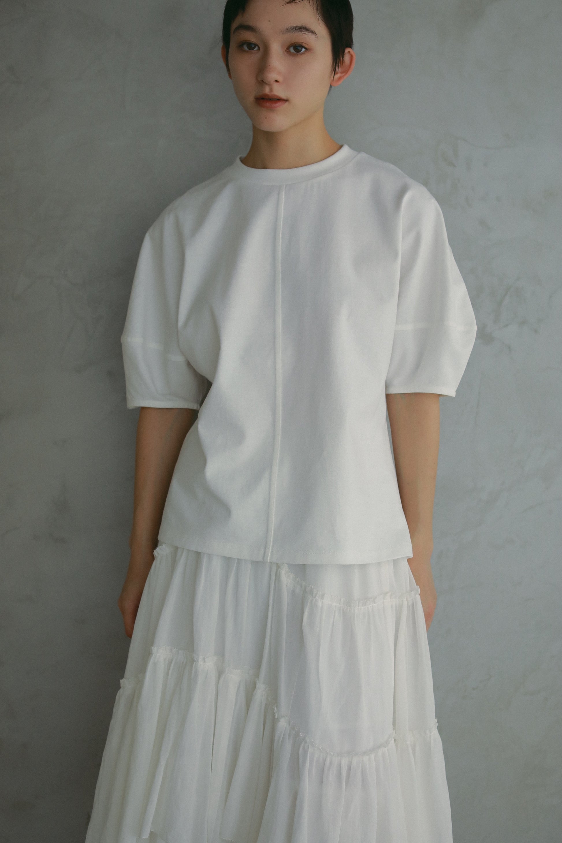 生地の切り替え部分をラウンドさせることでアシンメトリーなラインと柔らかな雰囲気を表現しました。