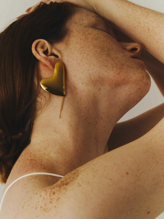ニュアンスのあるハート型のプレートパーツに、片側のみステッチのようなチェーンをあしらったデザインのピアスです。