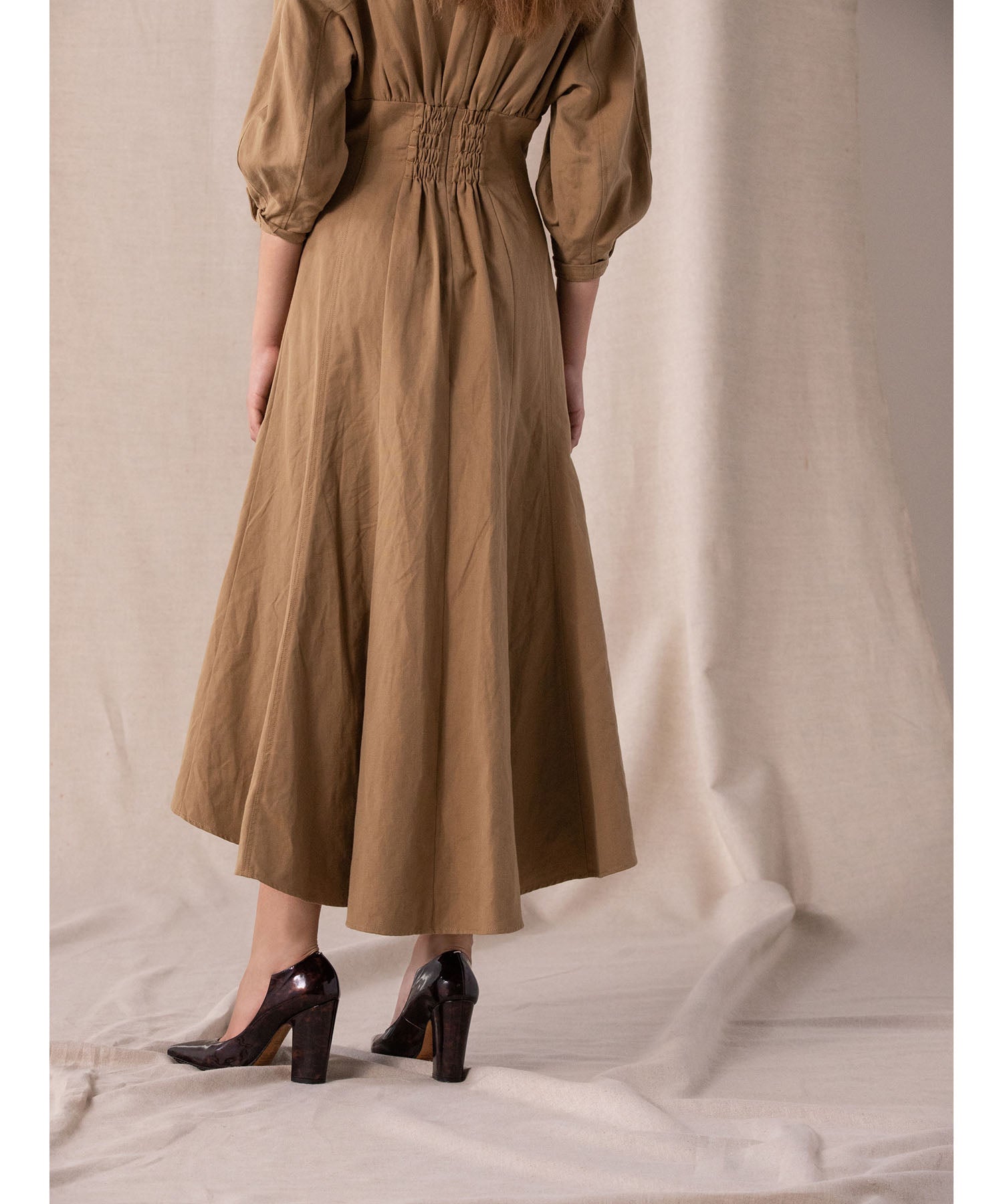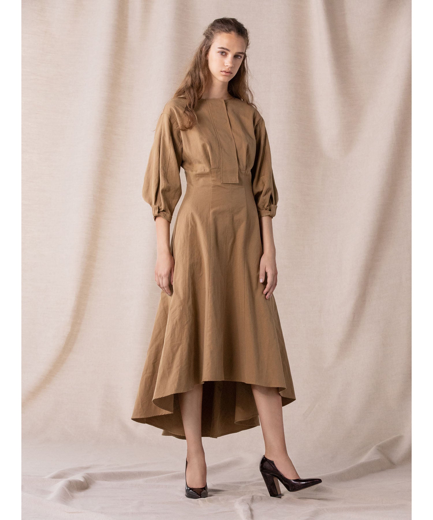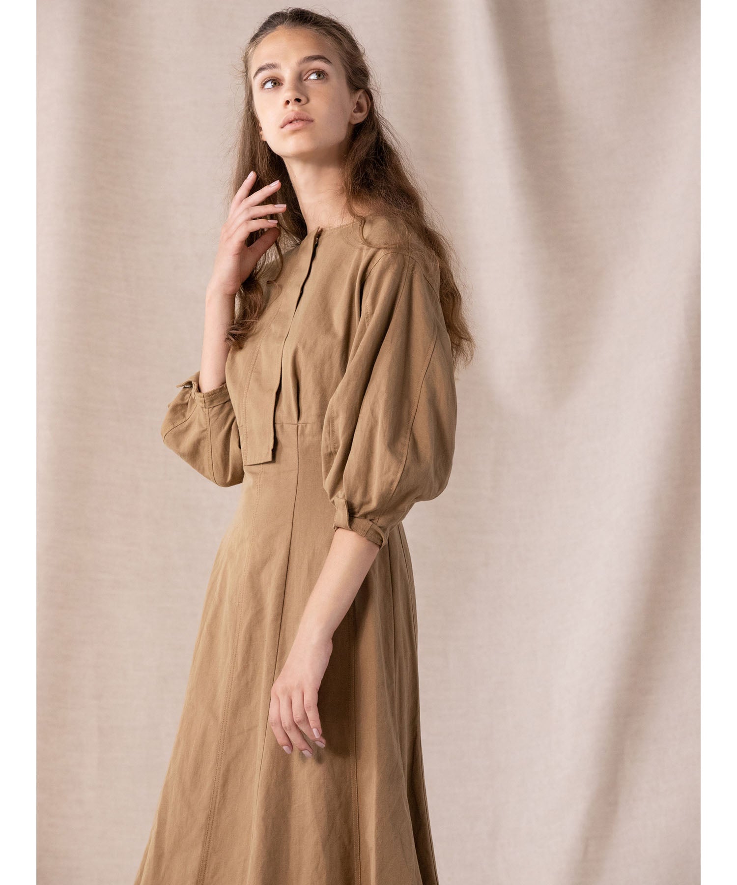 ノーカラーデザインで、ノーブルな女性らしさを演出するワンピース。バックスタイルで魅せる、生地を豊富に使ったタップリとボリュームあるひだのスカートが魅力的です。絞った袖口のデザインも、目を惹くポイントになっています。