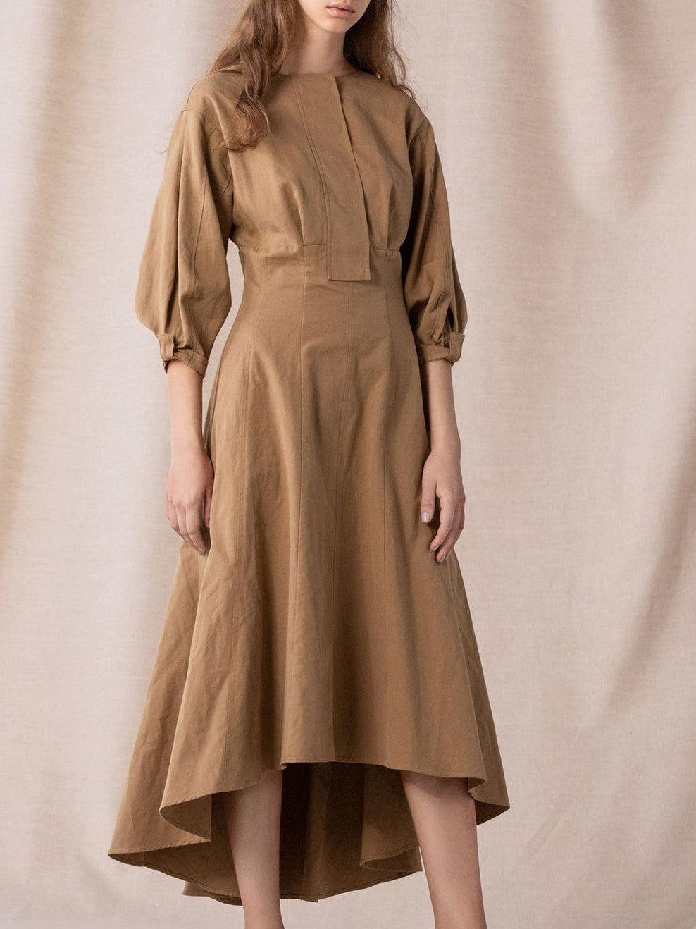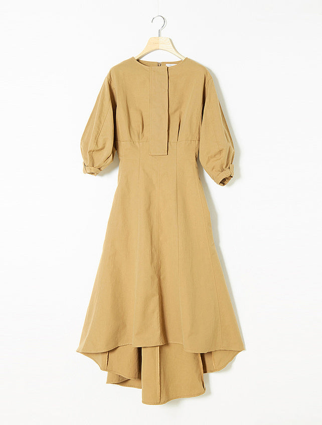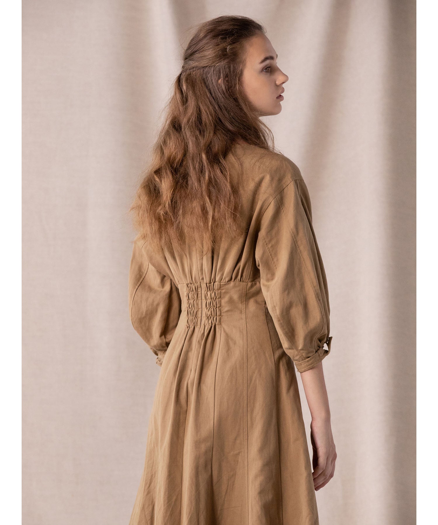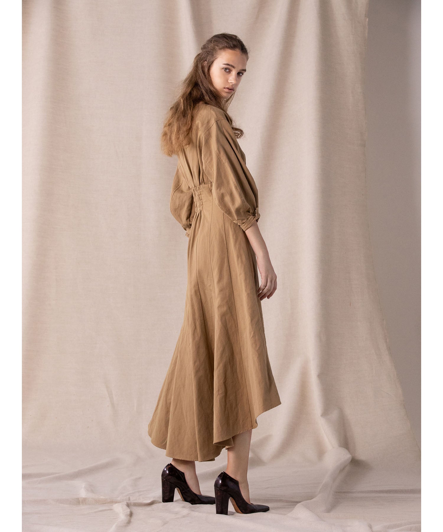 ノーカラーデザインで、ノーブルな女性らしさを演出するワンピース。バックスタイルで魅せる、生地を豊富に使ったタップリとボリュームあるひだのスカートが魅力的です。絞った袖口のデザインも、目を惹くポイントになっています。