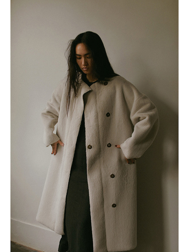 エコファーとスエード生地を重ねたリバーシブル仕様のため、保温性も高いコートに仕上げました。