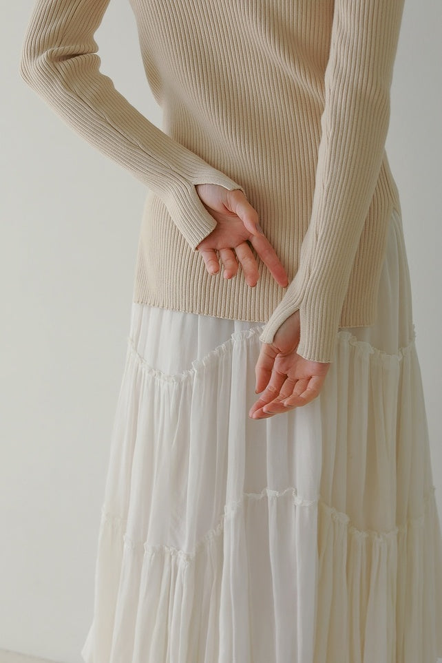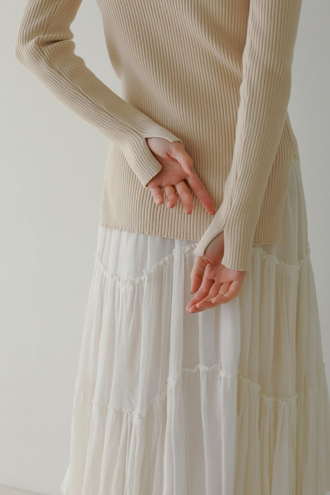 糸の撚りを強め、さらに、ナイロンを混紡することで糸の強度を上げ、毛玉になりにくいニットトップス。