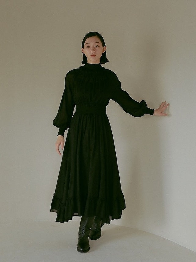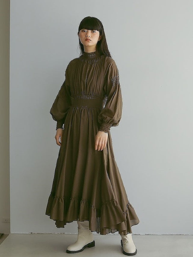 シャーリングが施されたハイネックやアシンメトリーな裾ラインがCASAFLINEらしいドレス。