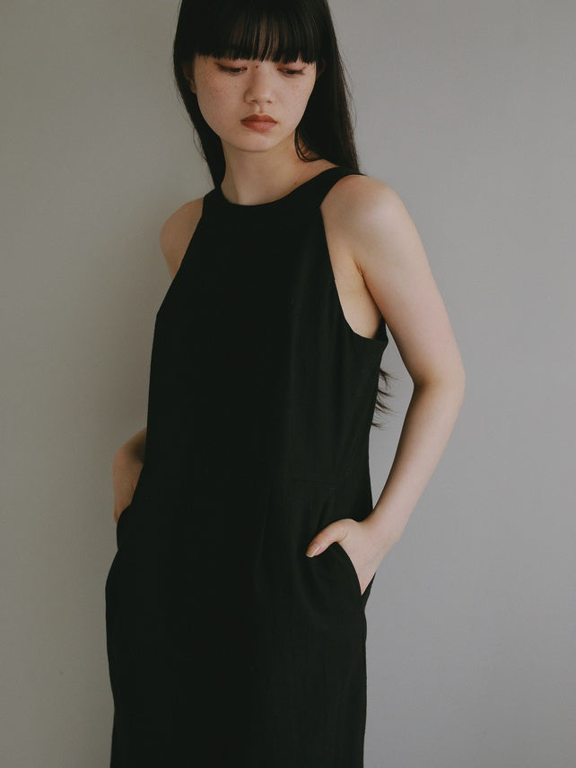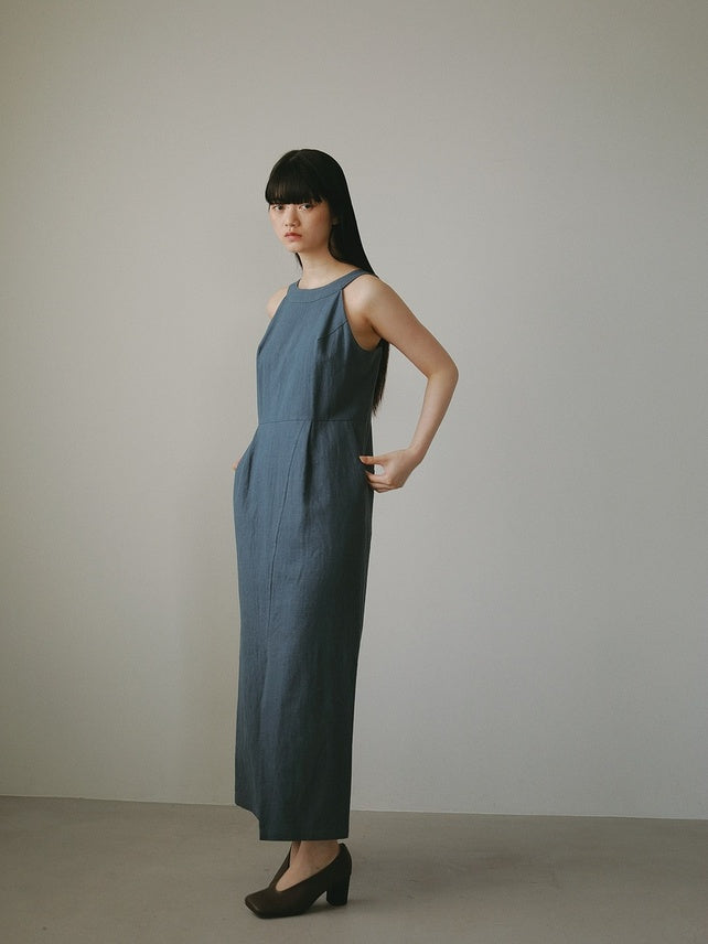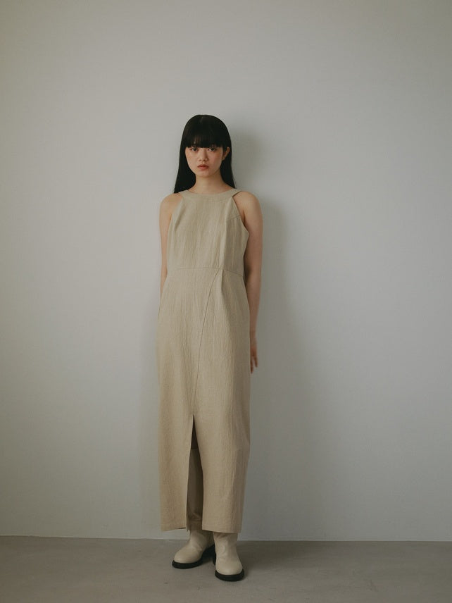 コットン/リネンのキャンバスにビンテージ風のシワ加工が施された素材を使用。首回りは詰まっていながらデコルテを綺麗に見せるカットが特徴です。スカート部分はシンプルなロングシルエットにする事で無駄のない洗練された印象に。