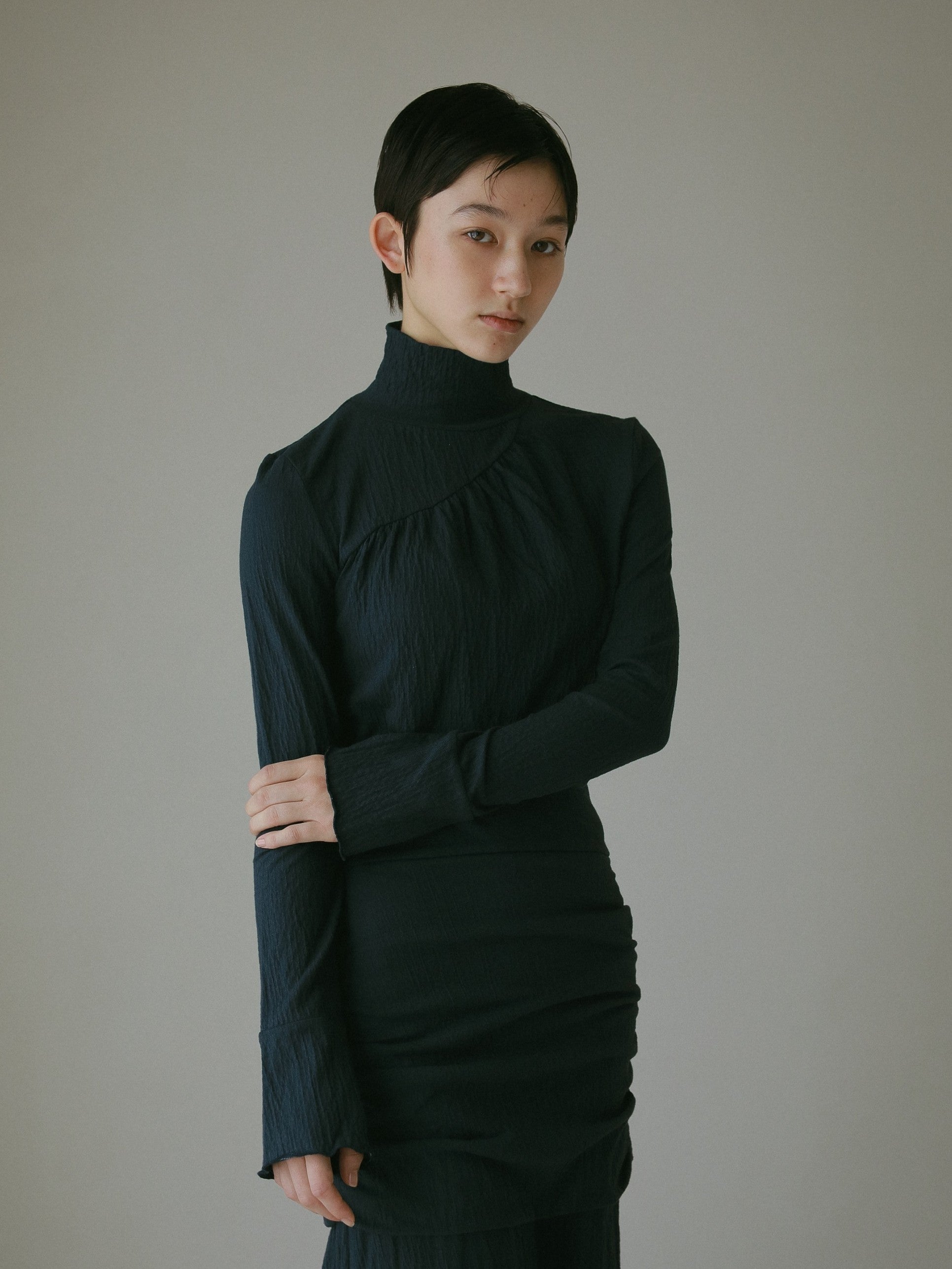斜めのカットラインにギャザーを寄せることで動きあるデザインに。
