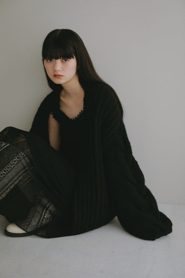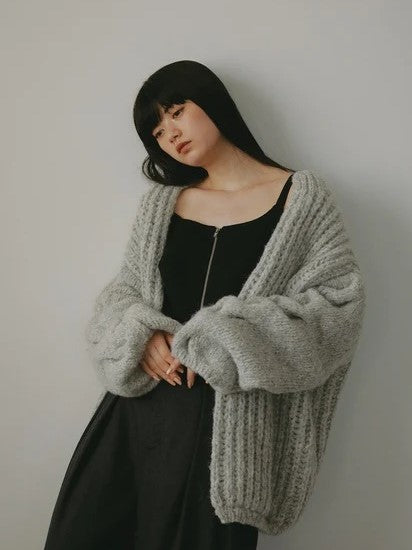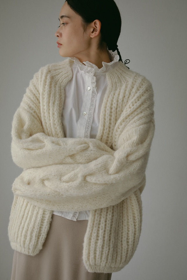ペルーにてひと針ひと針手で編み込まれたニットカーディガン。ざっくりと編まれた袖のケーブル編みは、手編みだからこそ表現できる立体感に。