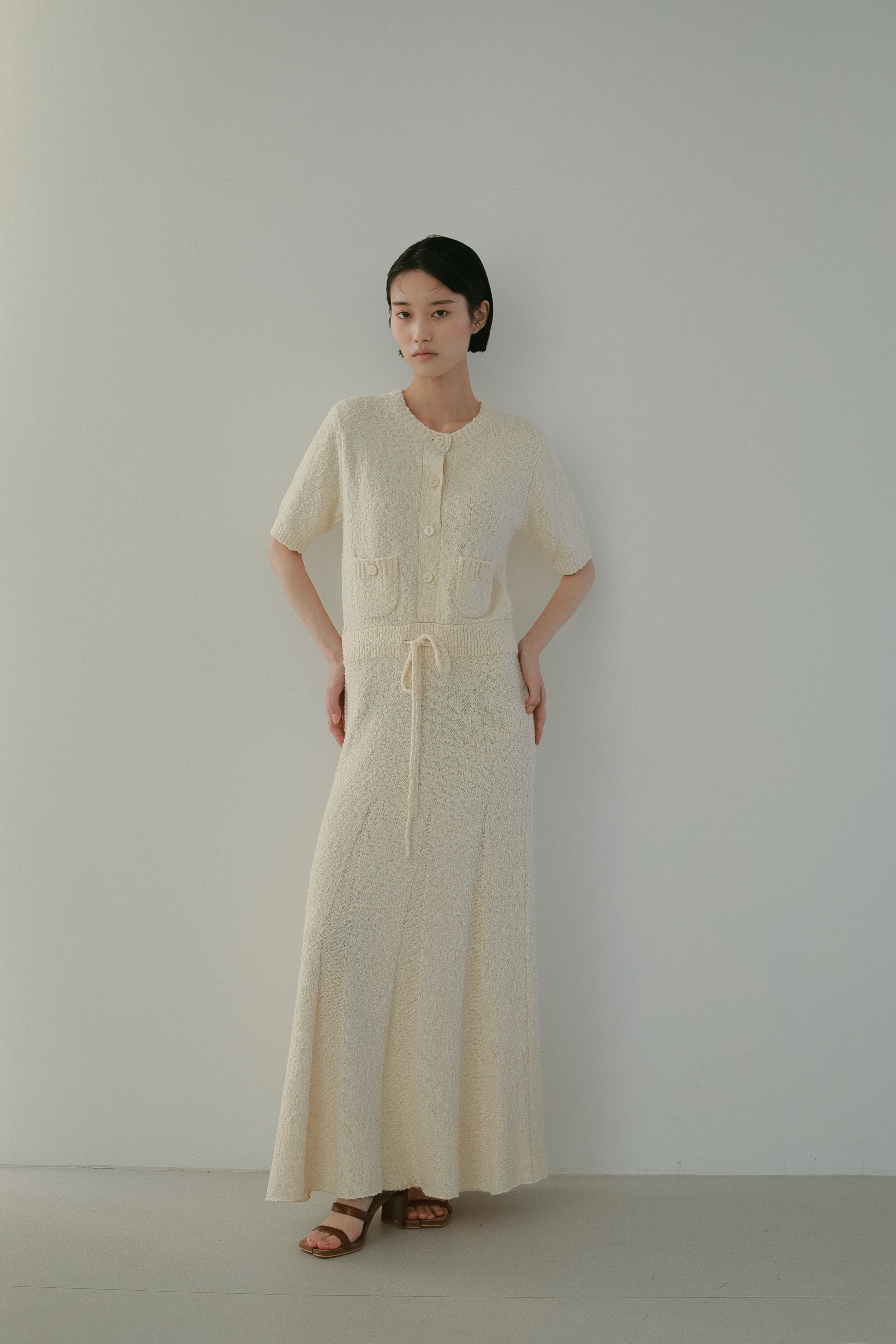 独特の風合いに仕上げた糸が、ドレス全体に強い印象を残します。
