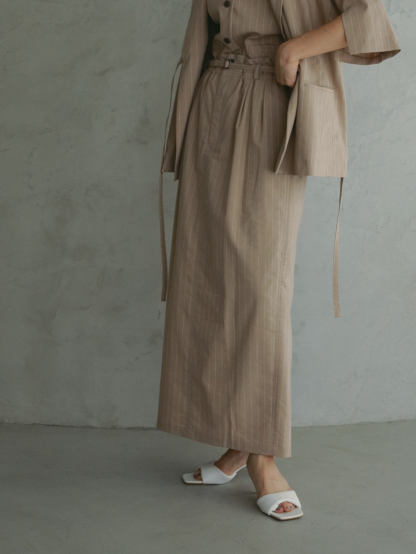 ハイウエストに同素材のウエストロングベルトがポイントとなるデザインは、Tシャツをインしてシンプルなコーディネートでもしっかりと主張するだけでなく、同素材アイテムとのセットアップなど様々なコーディネートでもワンランク上の仕上がりにしてくれます。