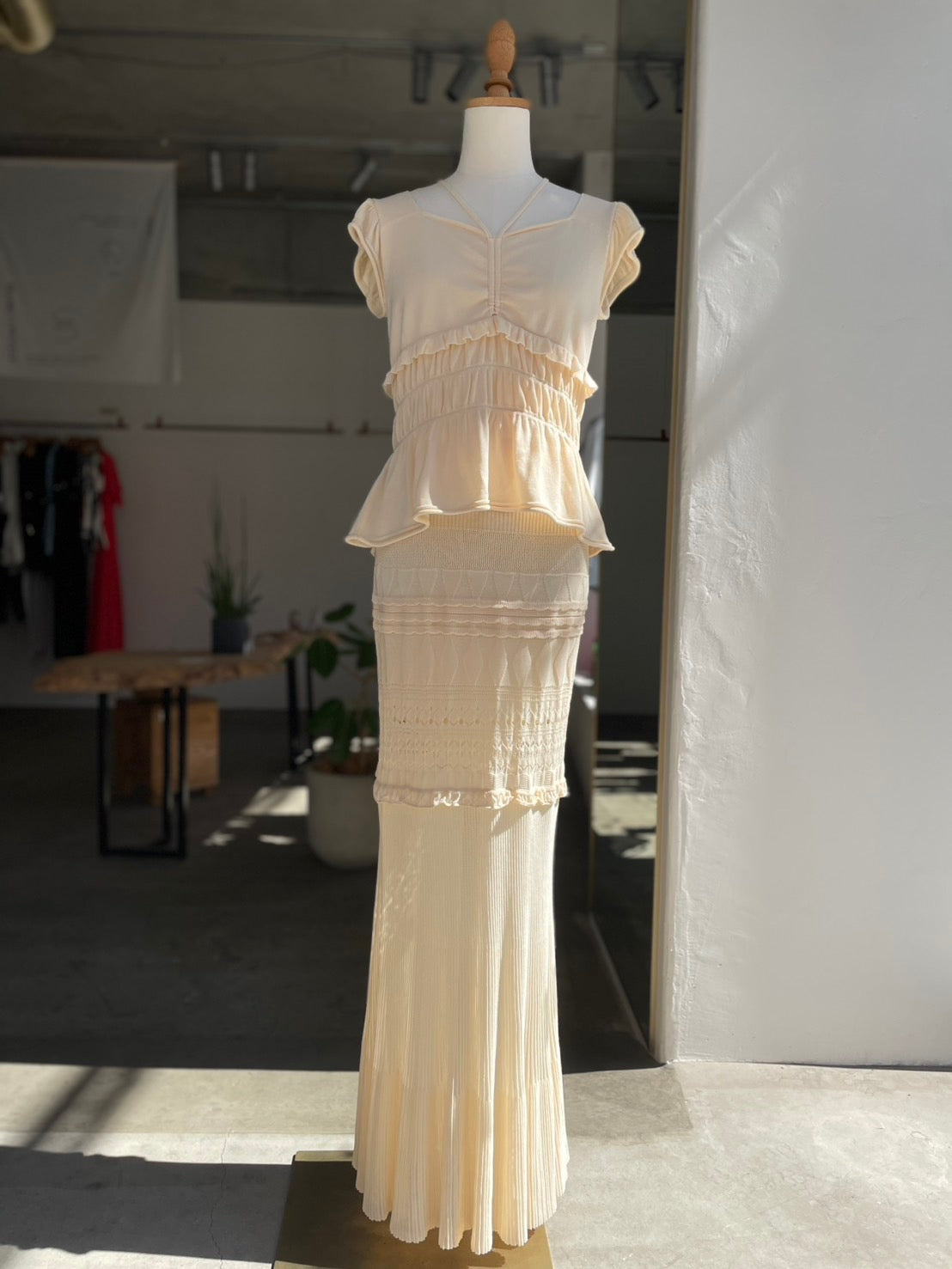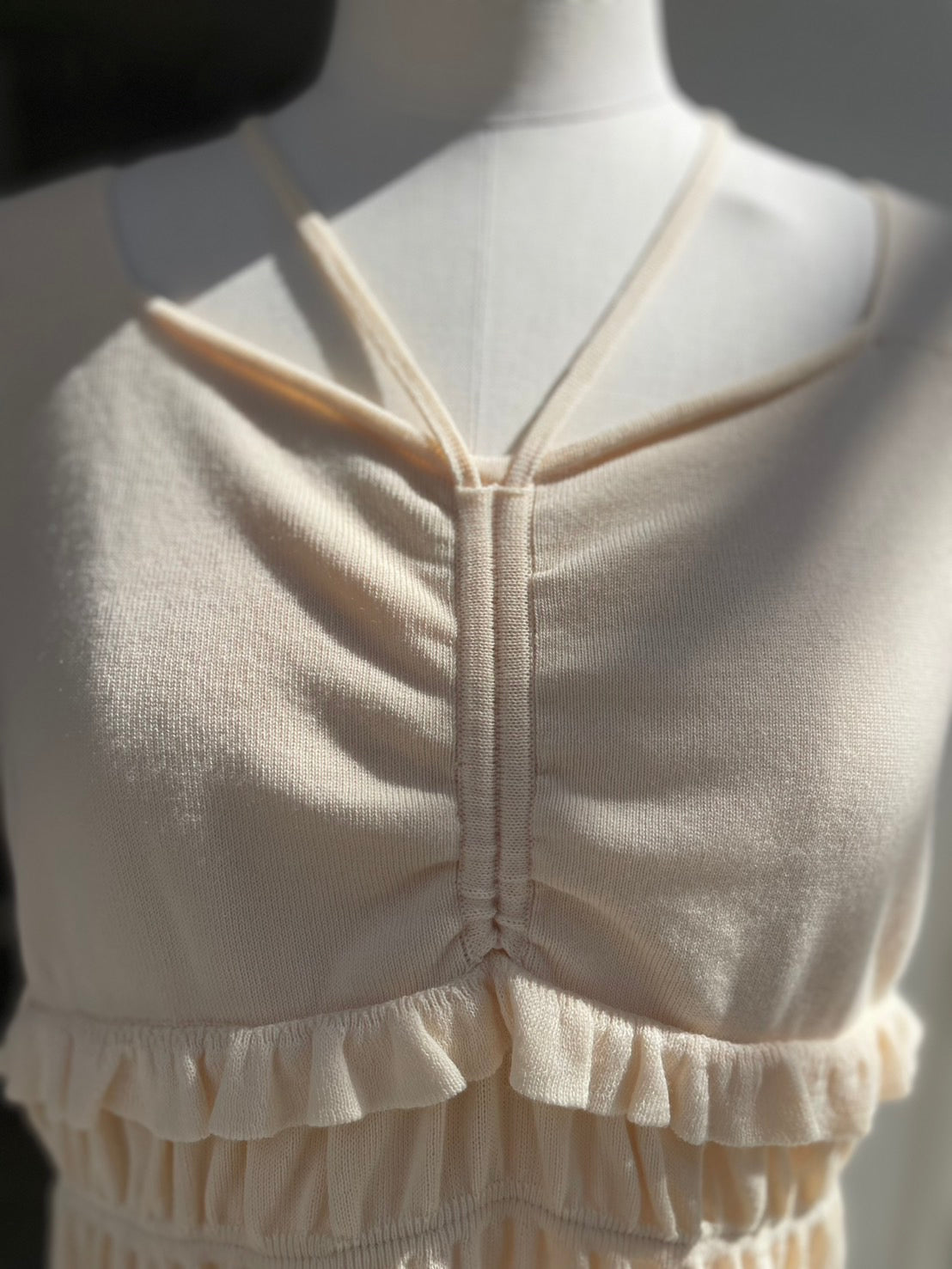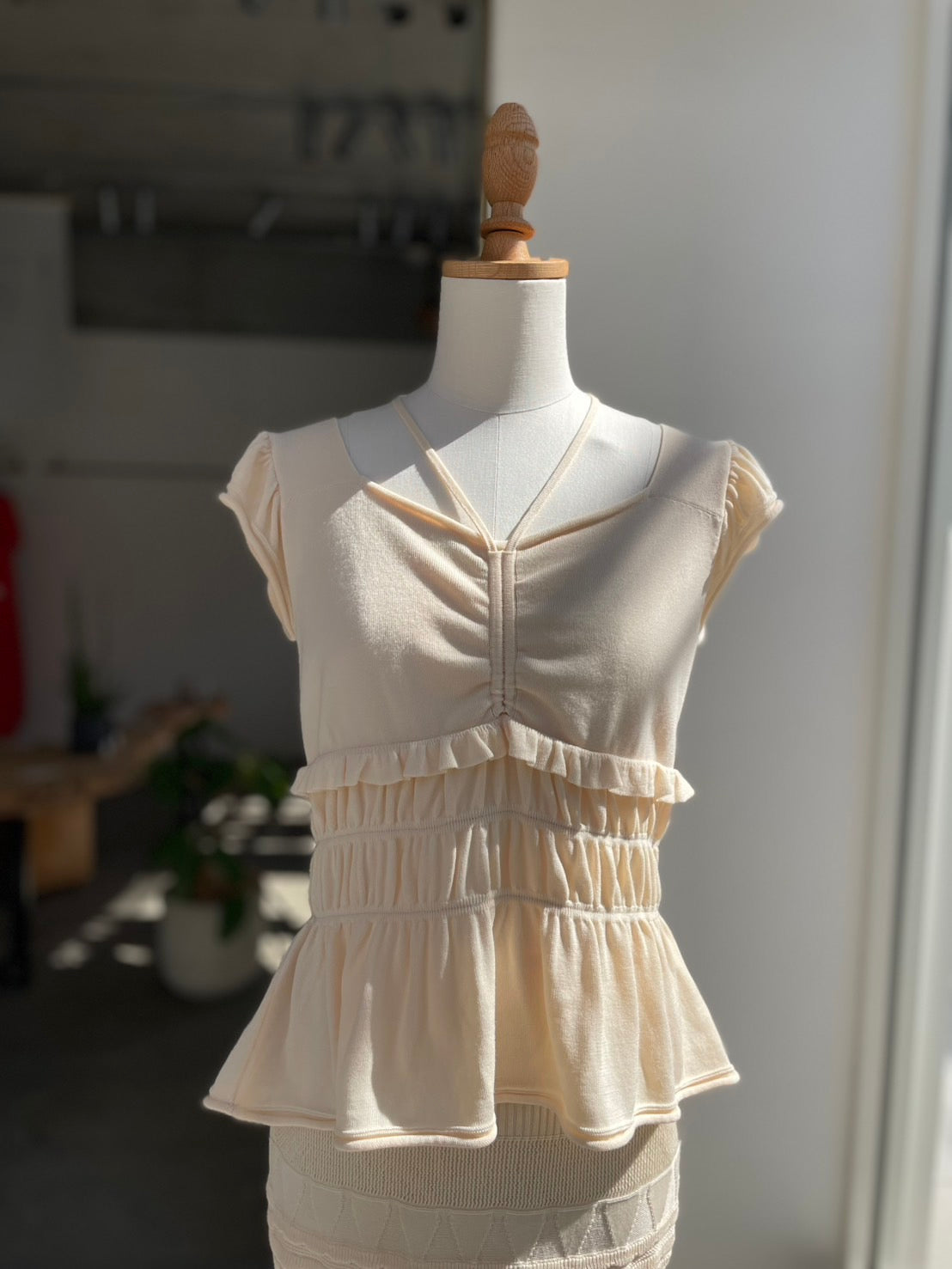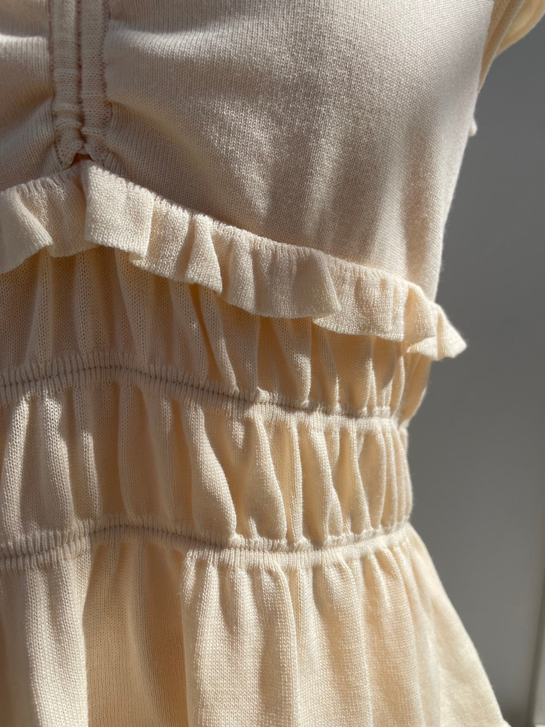 フレンチスリーブ、ギャザー、ホルターがアクセントになり、シンプルでありながら存在感のある一枚です。