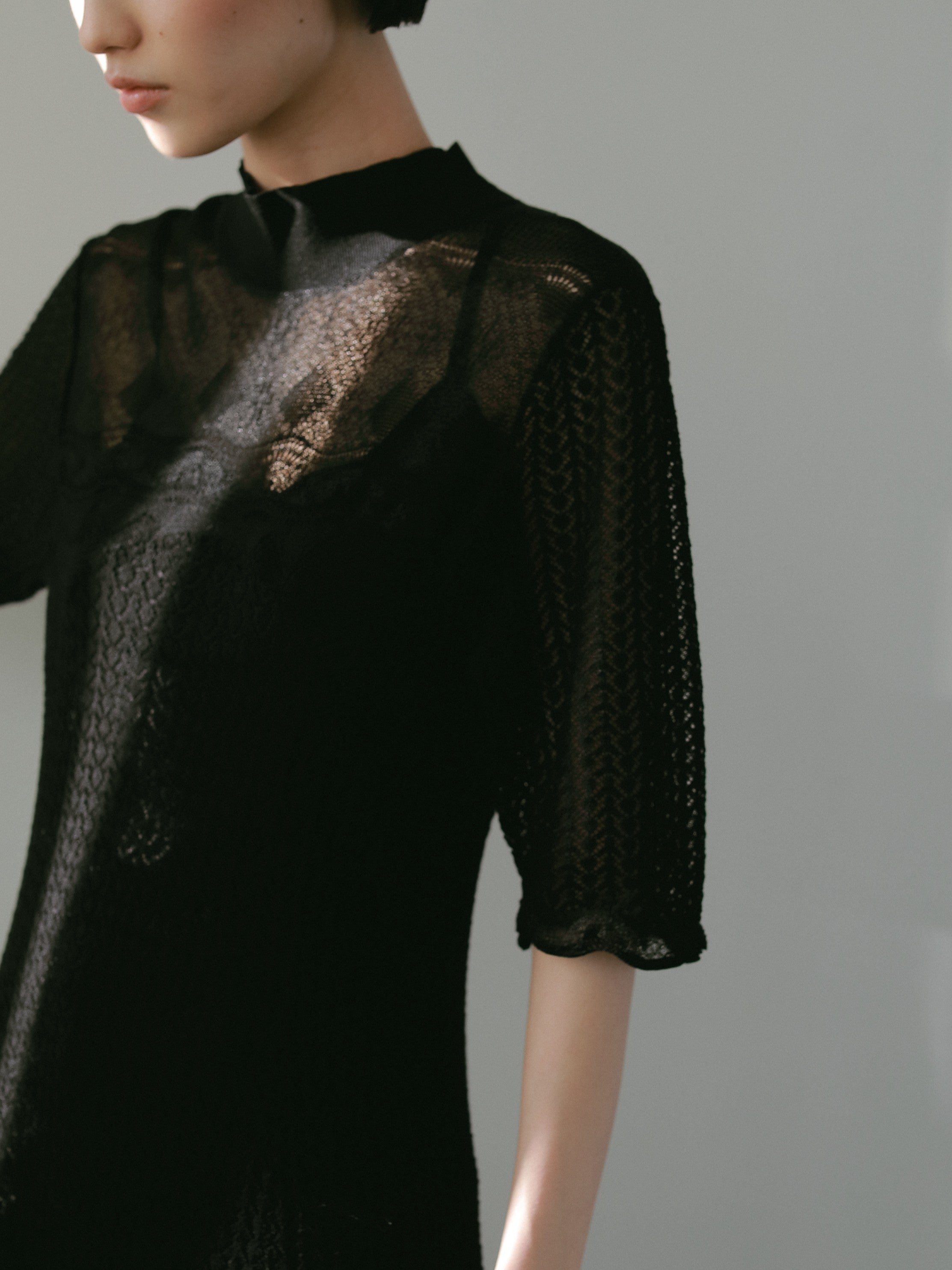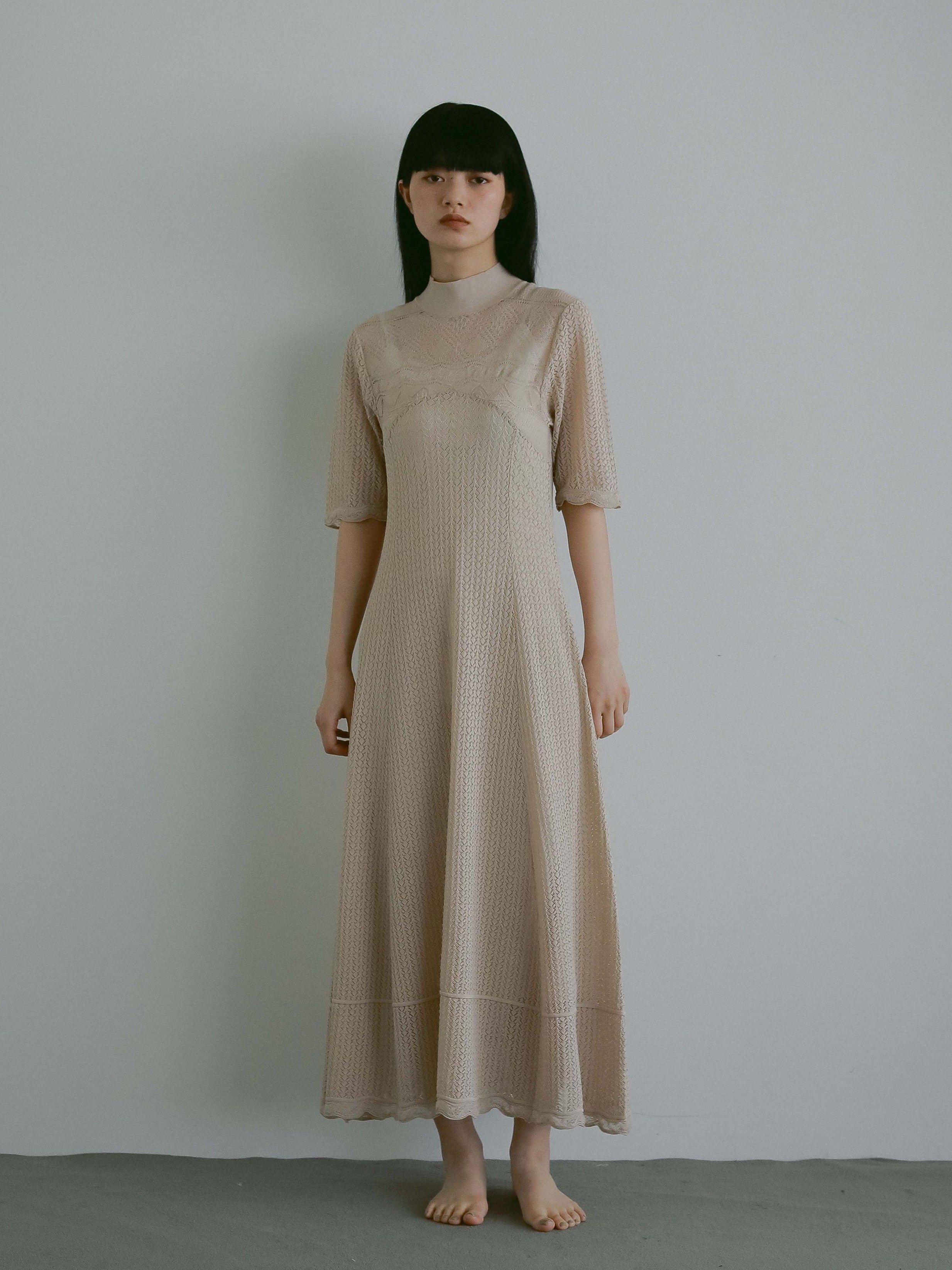 繊細な糸が表現する、可憐な素材感のニットドレスは、見頃のレースデザインに透け感を施し、上品な大人ドレスに仕上がりました。