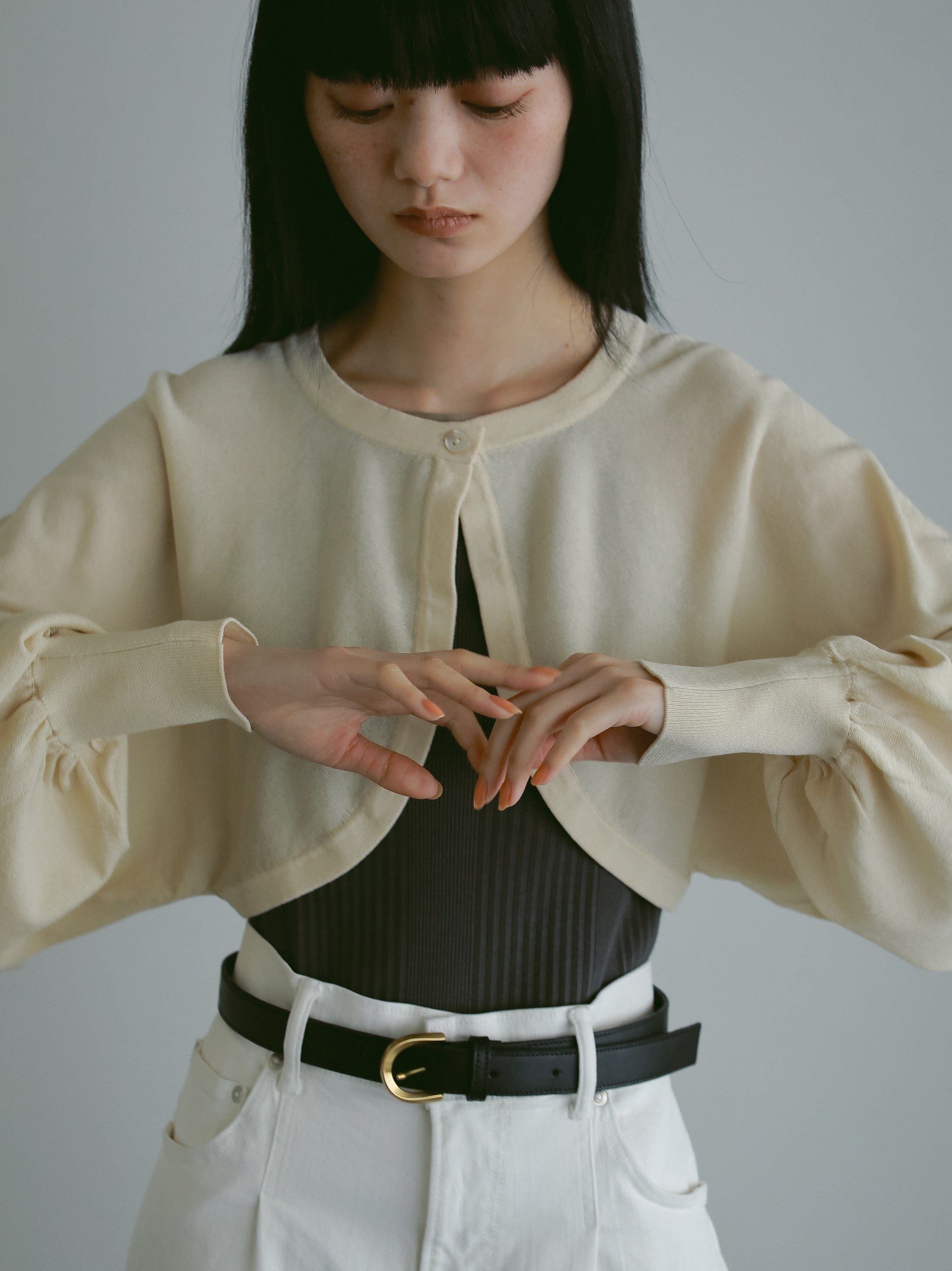カジュアルなデニムパンツのコーディネートにも合わせやすい、一枚あると便利なボレロです。