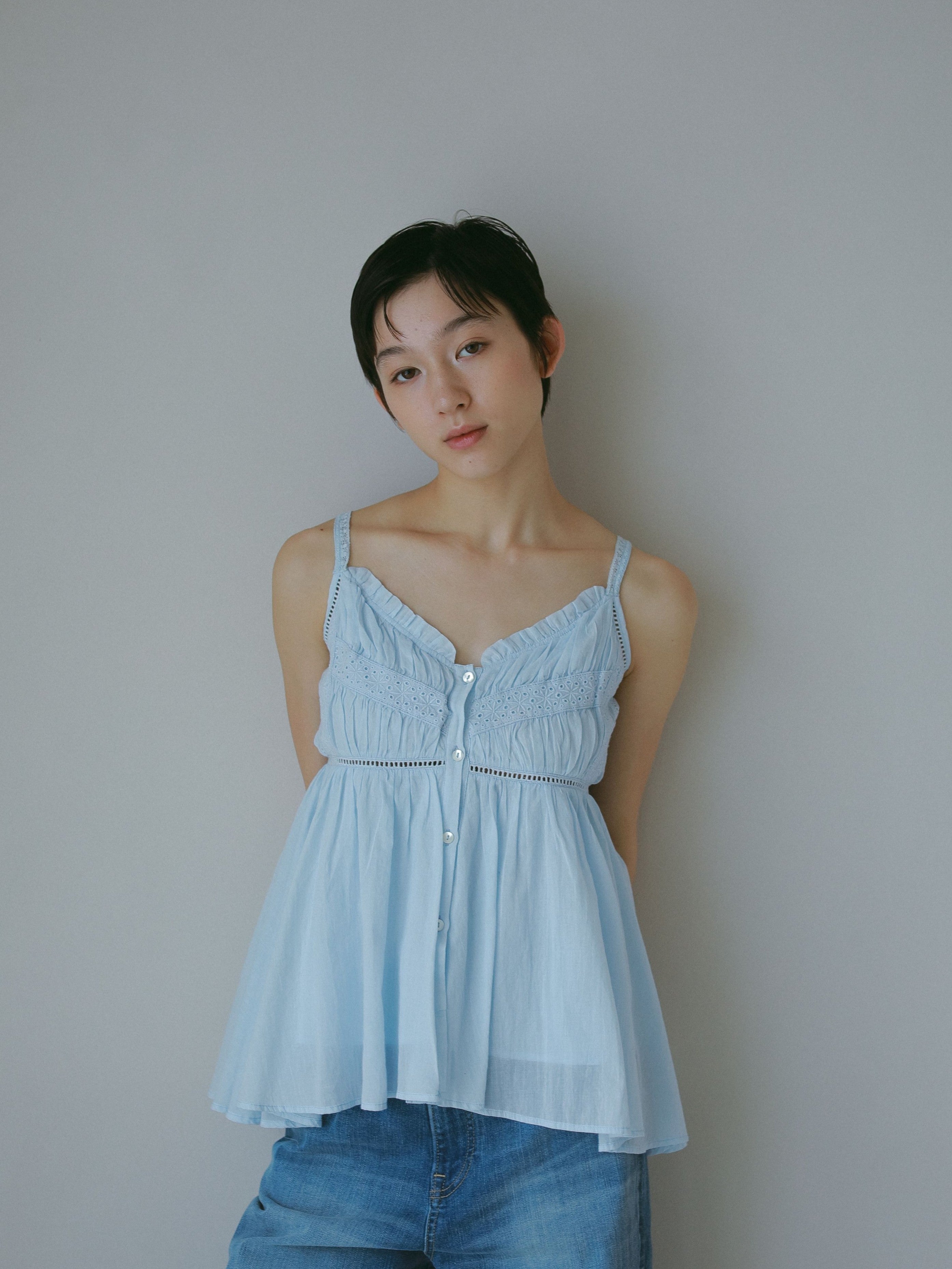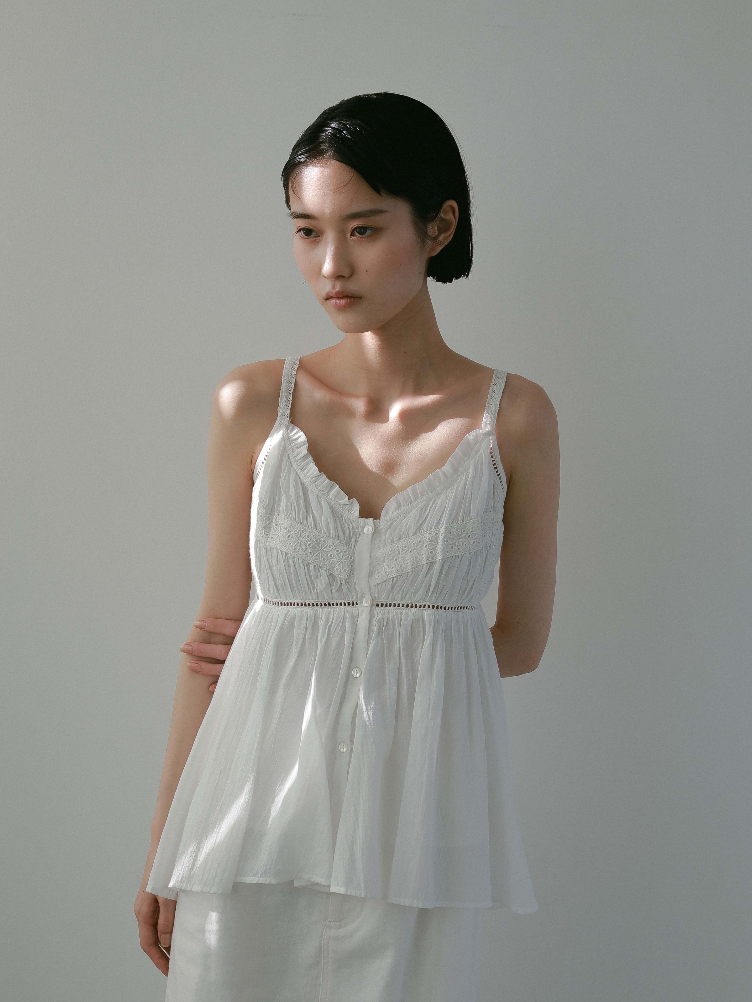 様々なレースやハシゴテープ、華奢なフリルがポイントのキャミソールは一枚で存在感大。