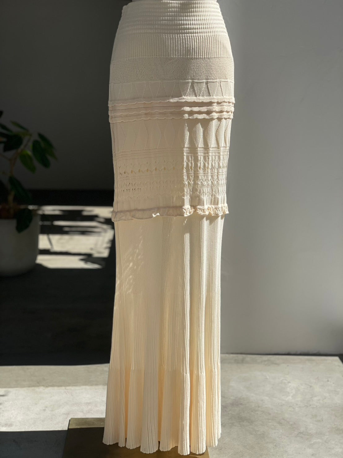 同素材のトップスとのコーディネートはもちろんのこと、お手持ちの白いTシャツを合わせるだけでも、スカートの上品さがカジュアルダウンしすぎないオトナなカジュアルに仕上げてくれます。