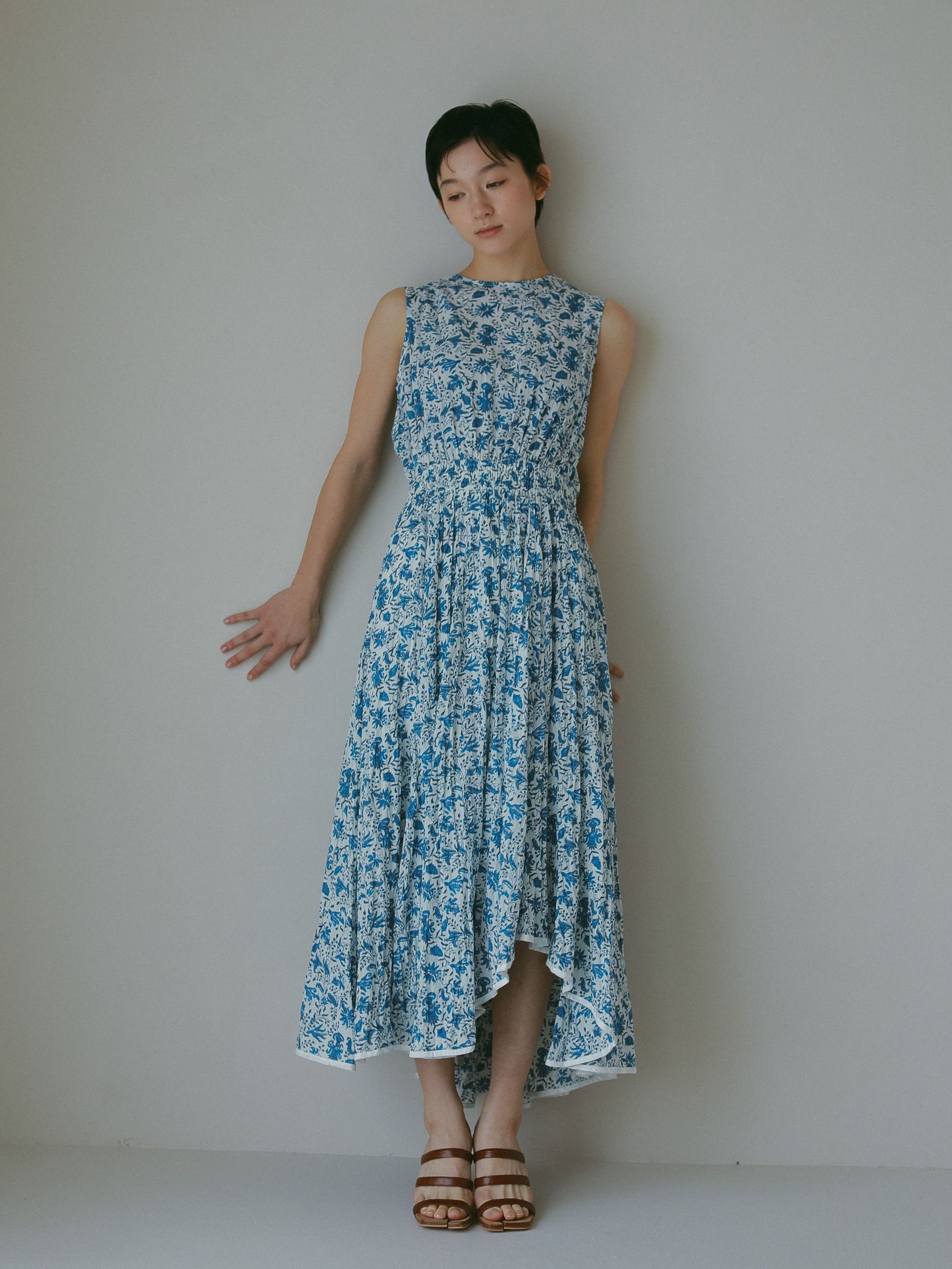 バックスタイルに特徴のあるデザインを、クラシカルなフラワープリントで可憐に表現したコットンドレス。