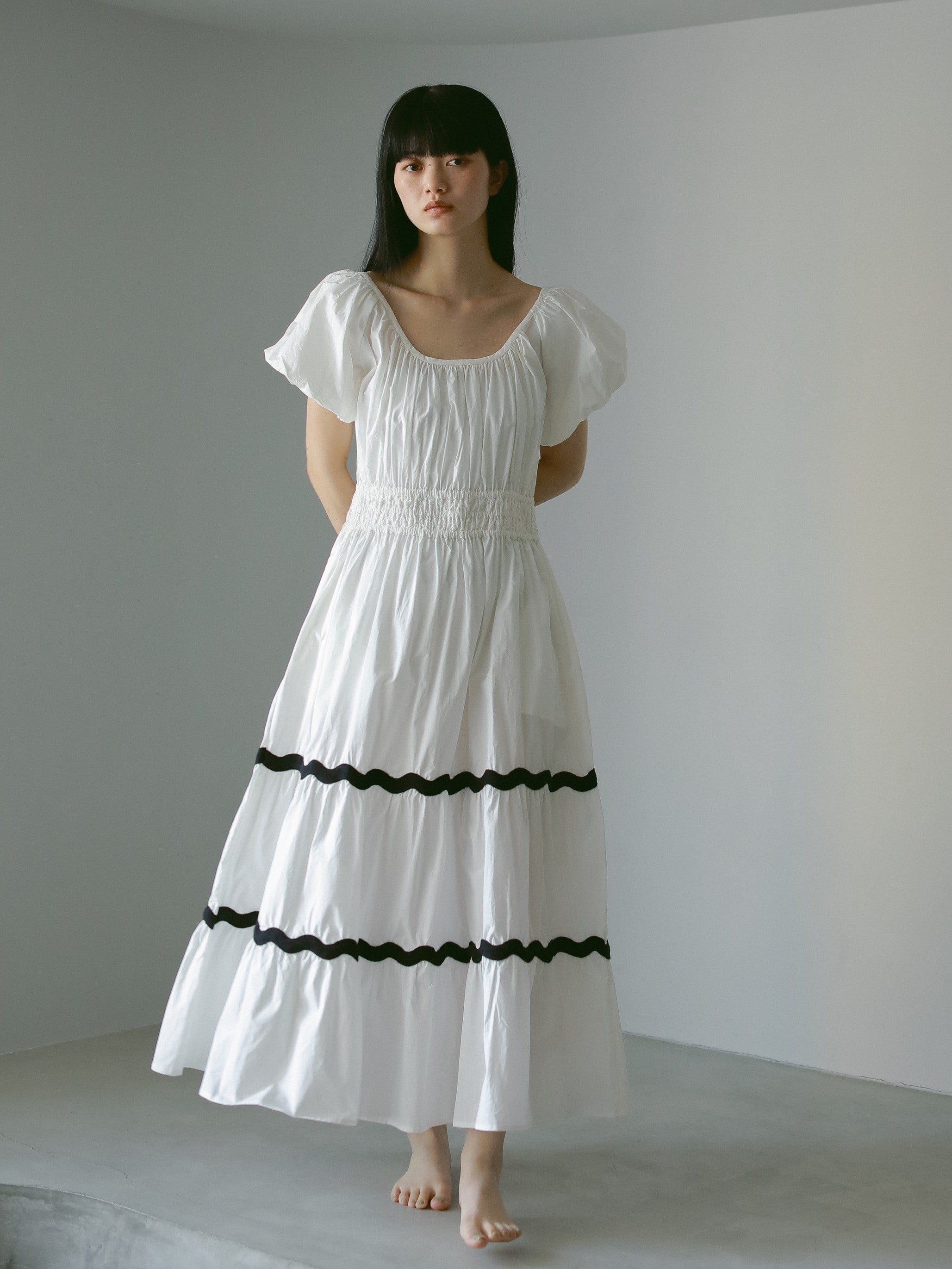 ドレス全体にたっぷりとギャザーを施し、配色のテープがインパクト大。