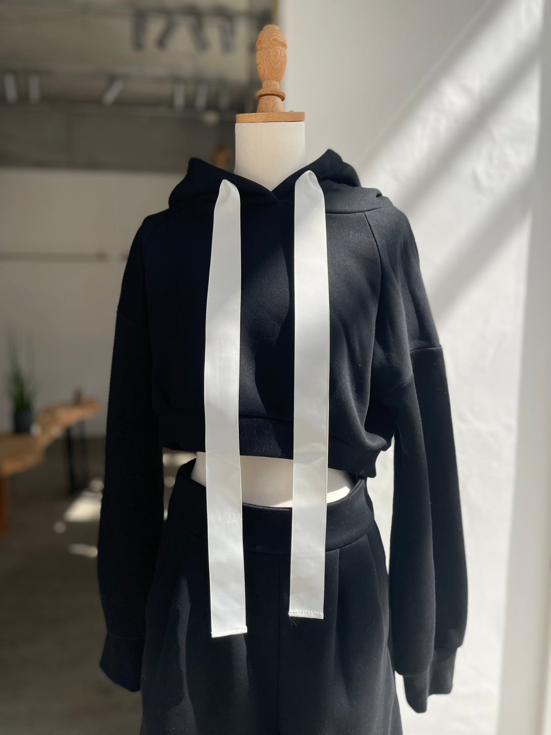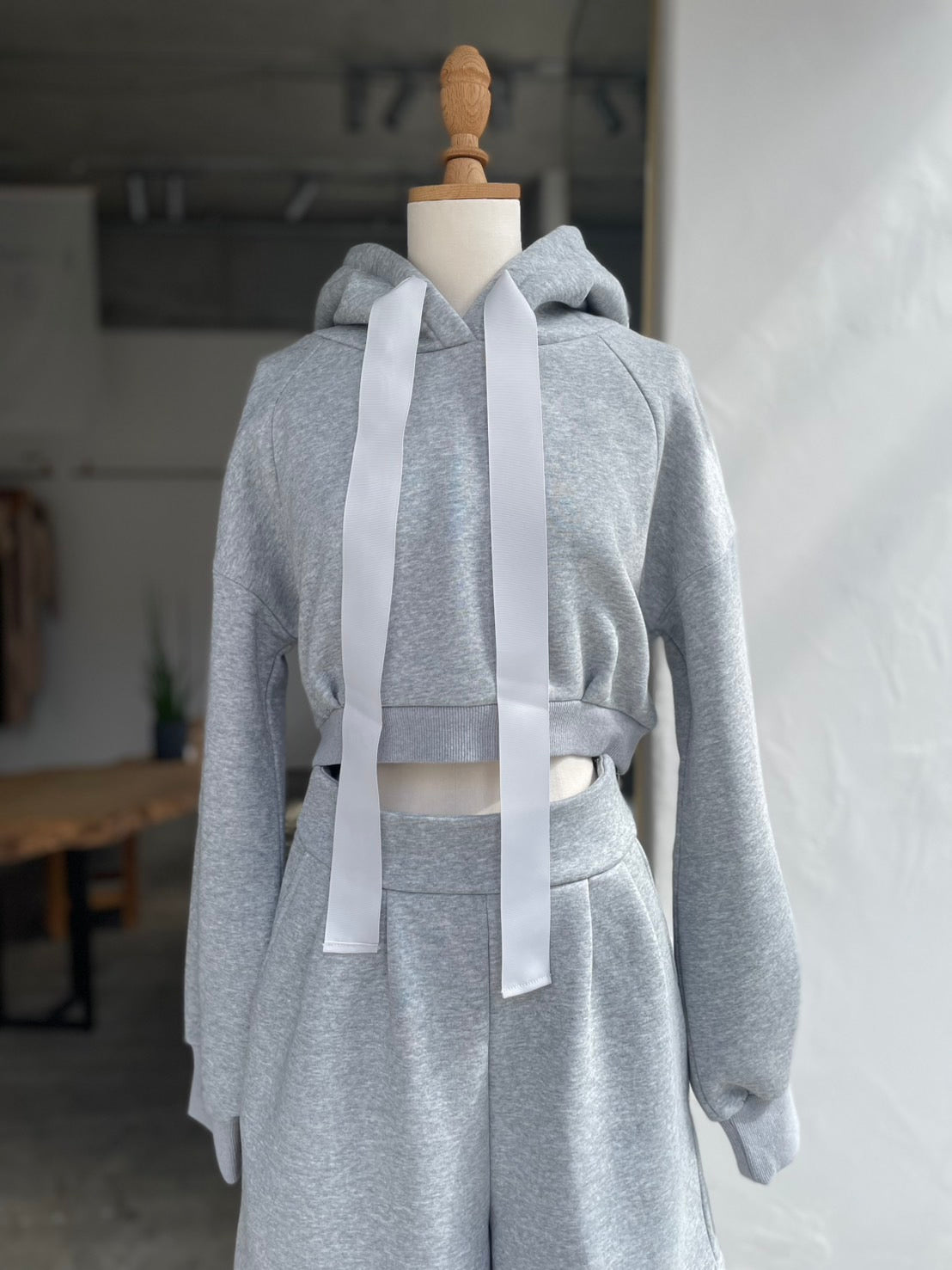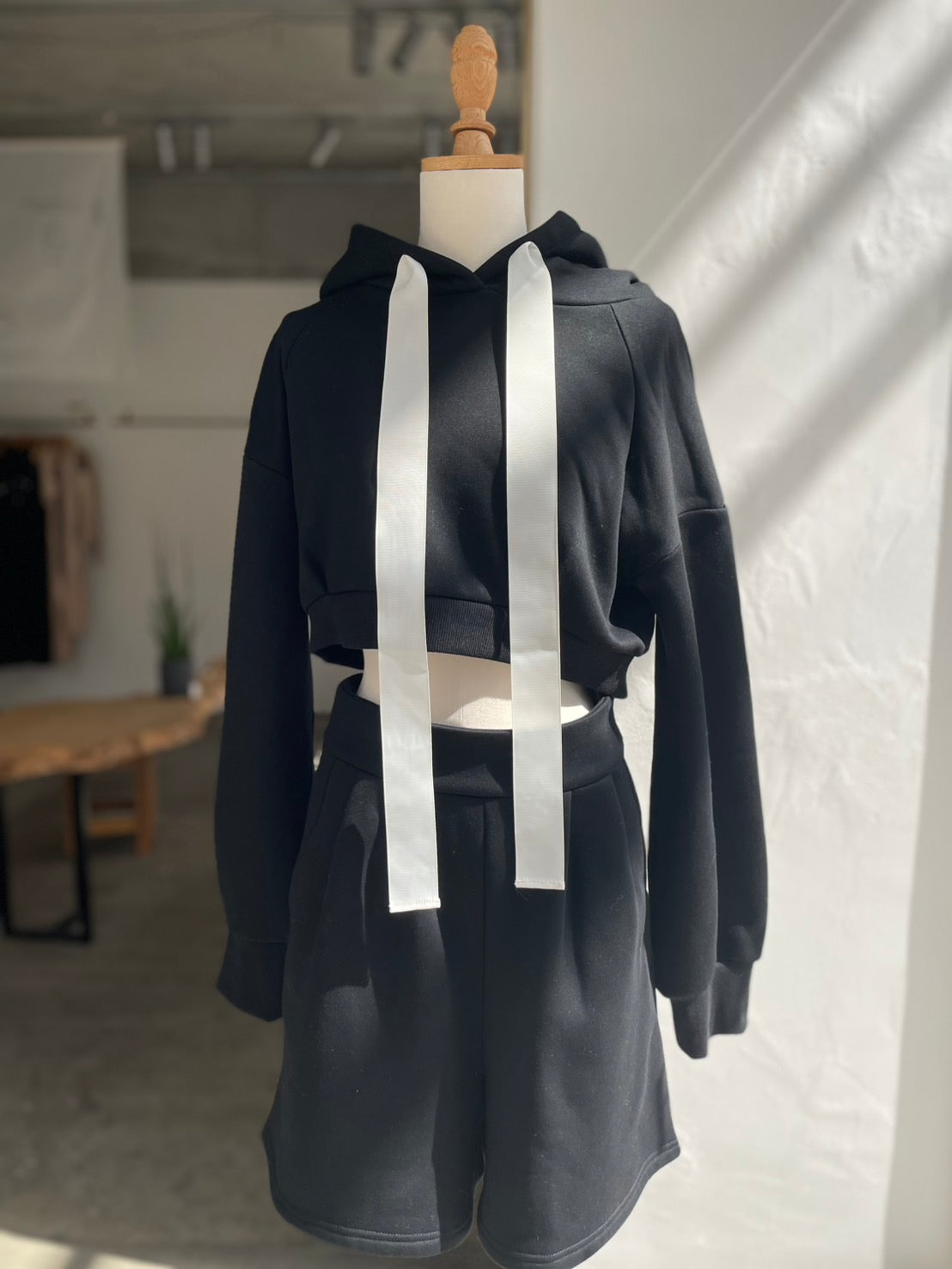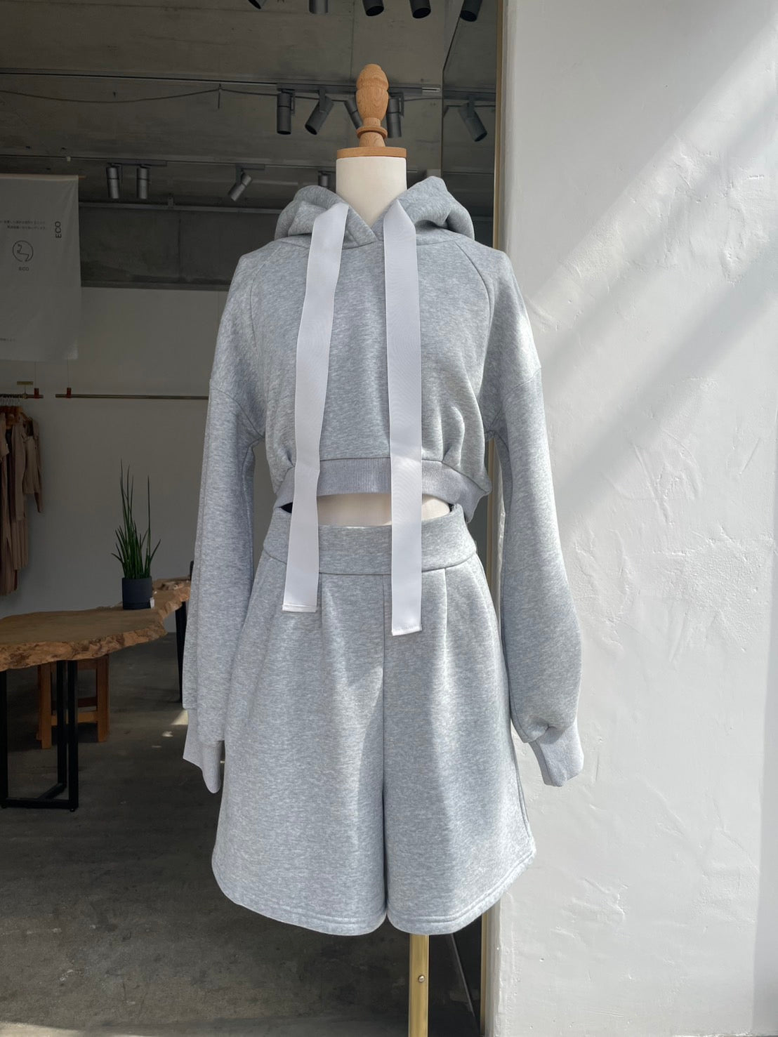ー ふんわり袖と太めパーカーリボンが可愛いおしゃれに着こなせるフーディ&ショートパンツのセットアップ ー